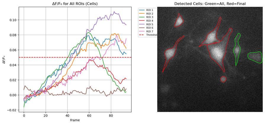 정리하자면, ΔF/F는 “칼슘 형광 신호의 변화율”로, 세포 활동을 쉽게 비교하고 시각화하는 만능 잣대입니다.