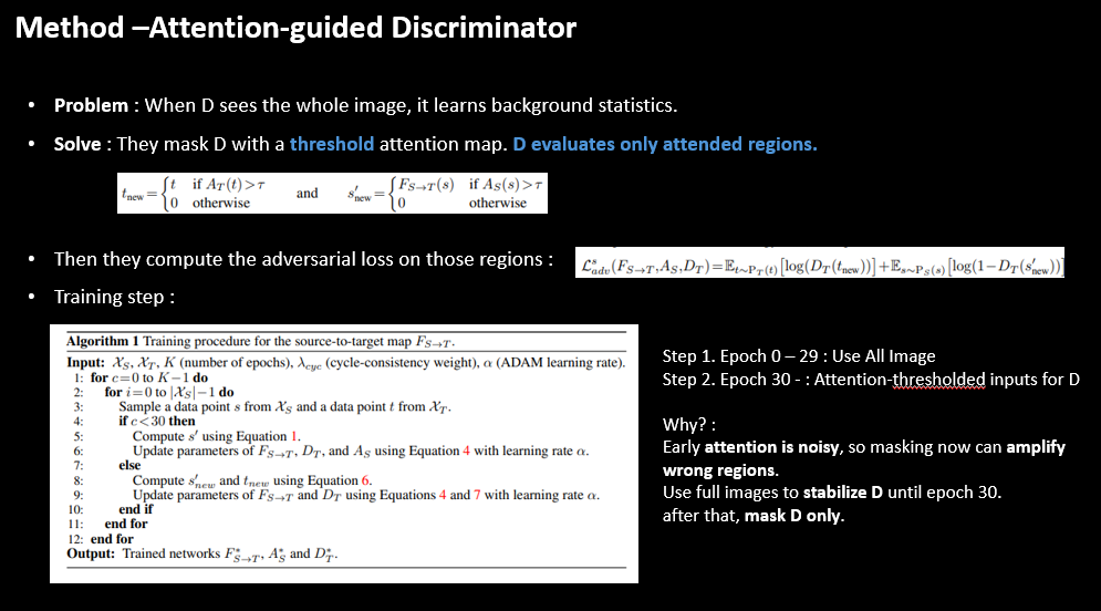 이후 epoch가 30이 넘어가면 Attention Map을 위에서 말한 Threshold로 이진화하여 마스크를 만들고, Discriminator에 적용한다.