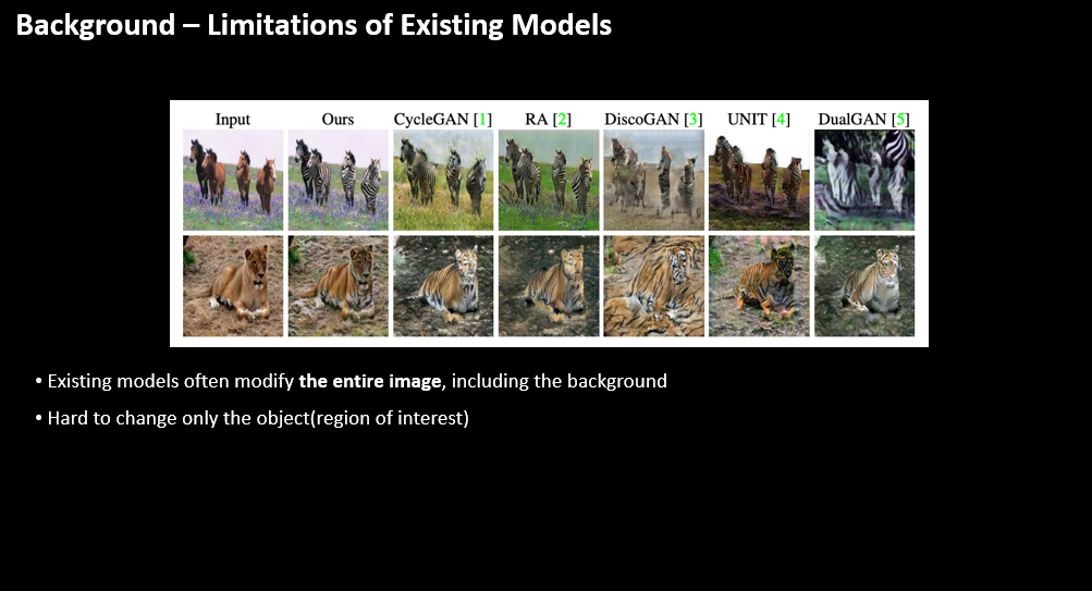 기존 CycleGAN 계열 모델은 내가 원하는 부분만 바꾸기보다 이미지 전체가 함께 변형되는 문제가 있다.