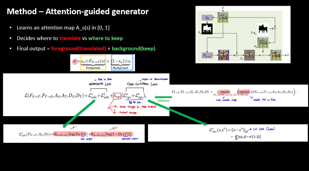 이 논문의 핵심은 간단하다. 어텐션 맵$(attention \ map)$을 학습해 변환이 필요한 영역만 선택적으로 바꾸고, 배경은 최대한 보존하는 것이다.