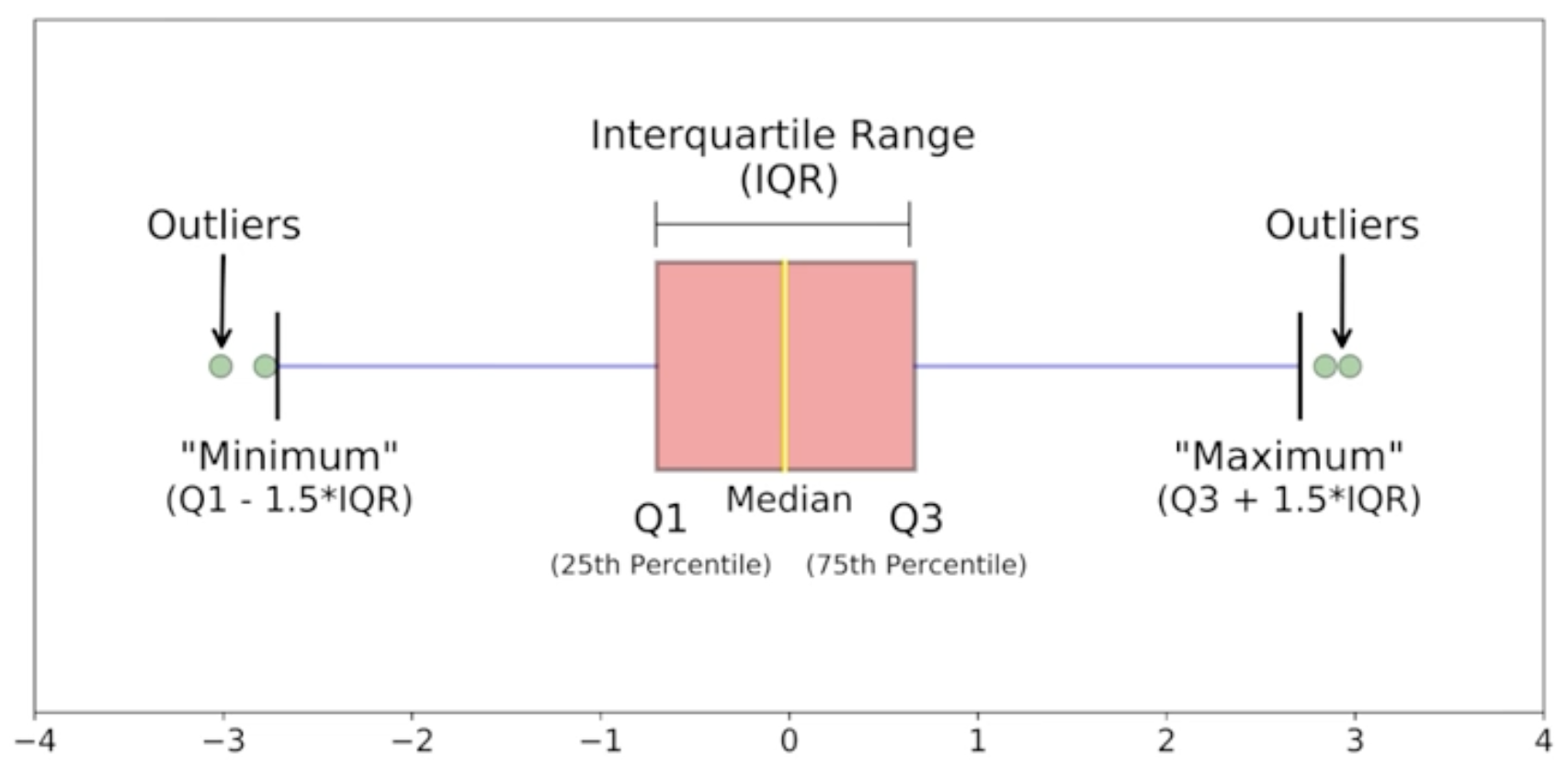 Box Plot은 데이터의 중앙값, 1사분위수(Q1), 3사분위수(Q3)를 이용하여 상자를 그리고, 상자 외부의 데이터를 이상치로 판단합니다. 이때, 이상치의 기준은 Q1 - 1.5IQR 이하의 값 또는 Q3 + 1.5IQR 이상의 값으로 설정합니다. IQR(Interquartile range)은 Q3 - Q1로 계산됩니다.