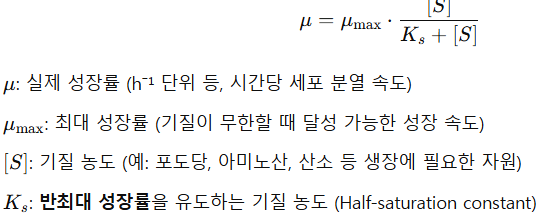 이때 사용하는 대표적인 수식이 바로 Monod Equation(모노드 방정식)입니다.